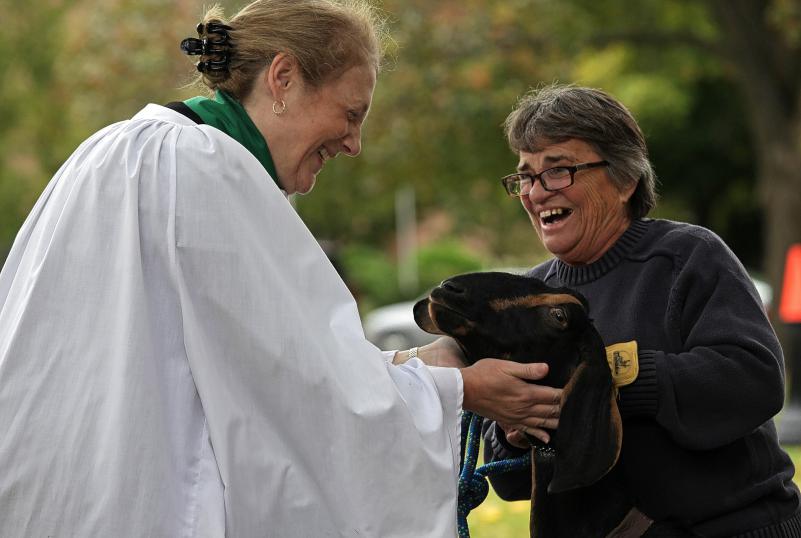 The Rev. Kate Atkinson of St. Paul’s Church blessed Moonbeam, a registered Nubian doe, as Carol Flavin of Canterbury holds her still. William Veenstra brought his goats Moonbeam and her 4-month-old Starlight to be blessed on the State House lawn on Oct. 4, 2014. (http://www.concordmonitor.com/home/13821383-95/photos-blessing-of-the-animals-held-on-the-state-house-lawn-for-the-first)